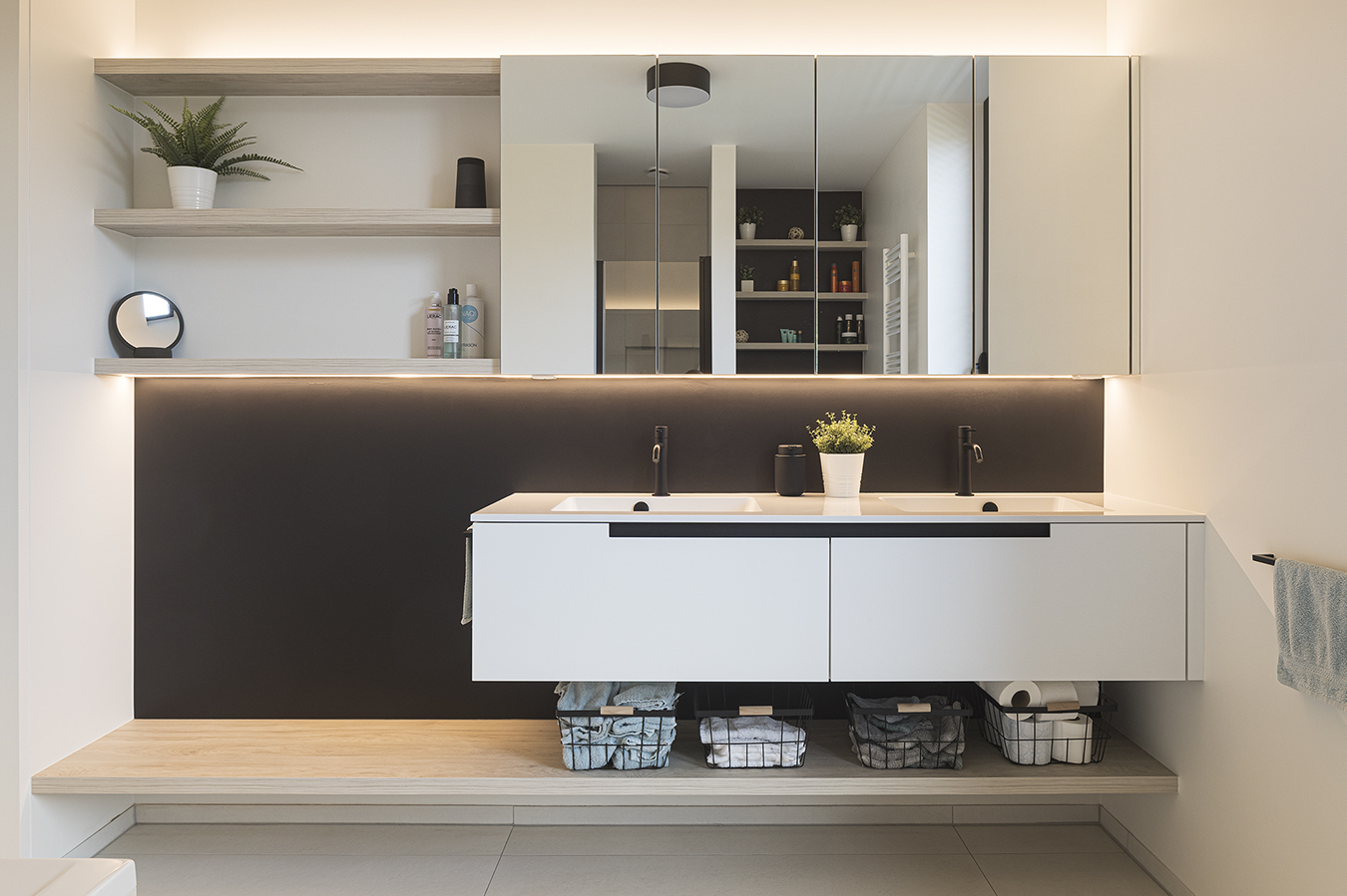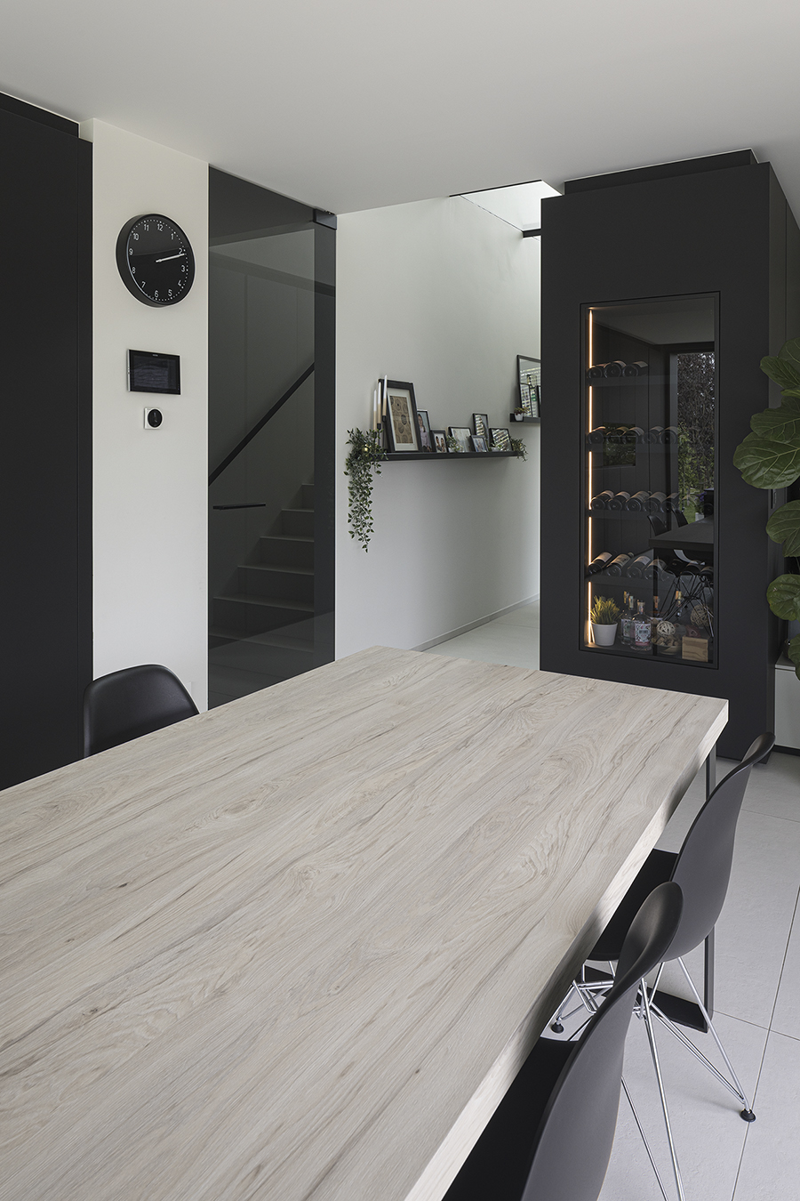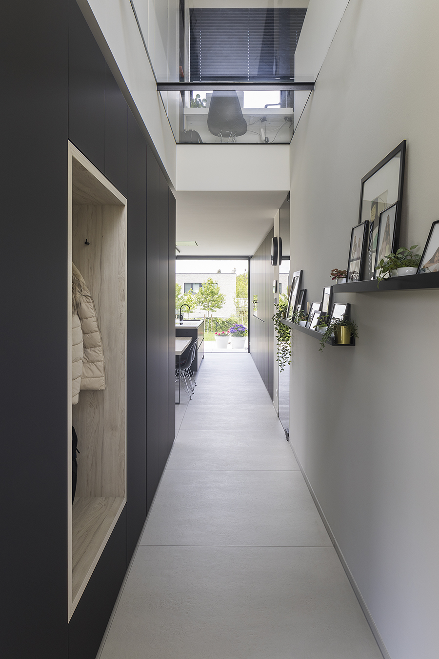 Binnenin hebben de bouwheren kosten noch moeite gespaard en het geheel van interieurafwerking mag dan ook gezien worden. Zo lopen de inkomhal, keuken en berging bijna naadloos in elkaar over. Mede dankzij de prachtige glazen deuren.
